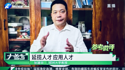 2023年11月2日下午,郑州大学张建华教授在盛和苑接受河南电视台记者连线采访,点评人才招聘过程中出现的一些问题。访谈于当晚在河南电视台民生频道大参考栏目中播出。