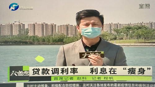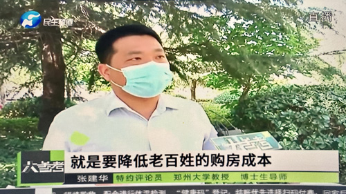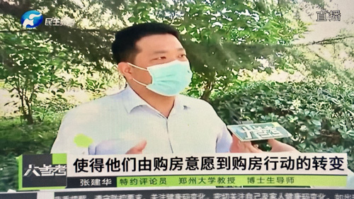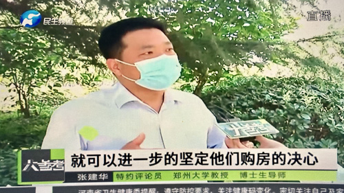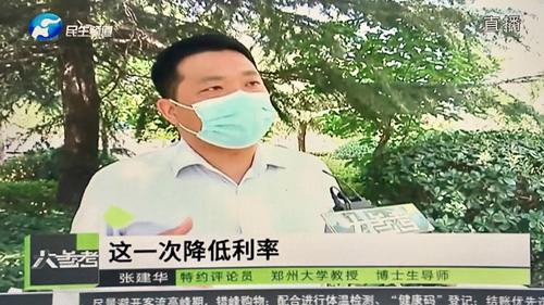 2022年5月16日上午,郑州大学张建华教授在盛和苑南门接受河南电视台记者采访,点评央行、银保监会降低首套房贷利率新举措。该访谈于当晚在河南电视台民生频道大参考栏目中播出。