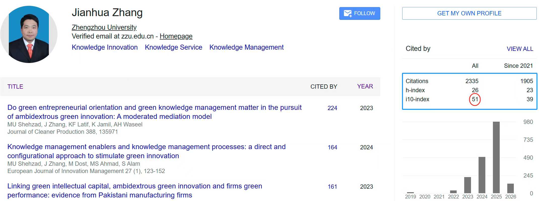 张建华教授科研i10指数再迎加1来到51(2026-2-10)
