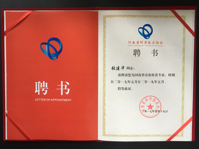 2017年8月2日收到聘书,郑州大学张建华教授 被河南省科学技术协会聘为“河南省首席科普专家”,专业领域:电子商务、信息化与信息系统。