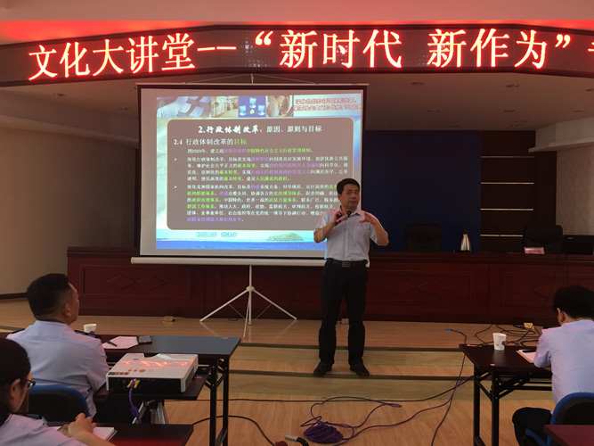2018年6月15日上午,在孟州市国家税务局,郑州大学张建华教授为其文化大讲堂——“新时代 新作为”,做题为《深化机构和行政体制改革,保障社会主义现代化事业发展》的专题讲座。讲座内容包括:“行政”的定义、行政机关”与“行政机构”、“行政体制”;行政体制改革的原因、深化党和国家机构改革的原因、行政体制改革的原则、行政体制改革的目标;行政体制改革的重点任务以及正确认识行政体制改革等。