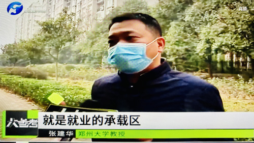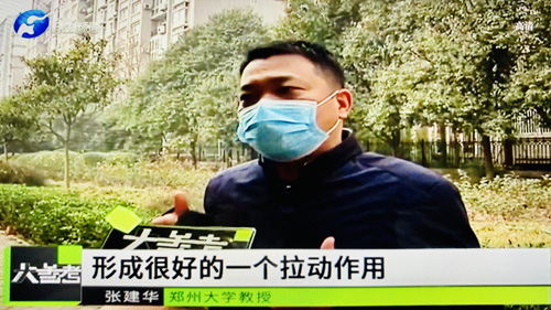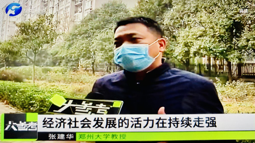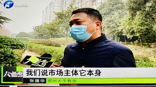 2022年12月9日中午,郑州大学张建华教授在盛和苑南门接受河南电视台记者采访,点评省市场监督管理局发布数据:河南市场主体总量突破千万户。访谈于当晚在河南电视台民生频道大参考栏目中播出。